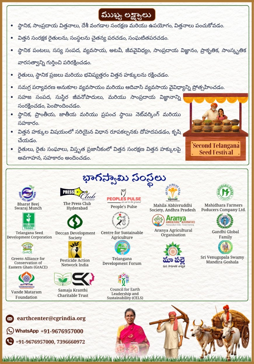 తెలంగాణ ద్వితీయ విత్తన పండుగ కు జిల్లా నలుమూలల నుండి రైతులు, విద్యావంతులు, మేధావులు,విద్యార్థిని విద్యార్థులు అధిక సంఖ్యలో పాల్గొని విజయవంతం చేయాలని యంగ్ ఎర్త్ లీడర్స్ ప్రోగ్రాం రాష్ట్ర కో.ఆర్డినేటర్ యానాల వెంకటరెడ్డి శనివారం విలేకరుల సమావేశంలో మాట్లాడుతూ మూడు రోజులపాటు నిర్వహించే స్థానిక సంప్రదాయ విత్తనాలు దేశీయ వంగడాల సంరక్షణ ప్రదర్శన కార్యక్రమానికి పెద్ద ఎత్తున ఏర్పాట్లు చేస్తున్నట్లు వారు పేర్కొన్నారు. గత సంవత్సరం 2025 లో సిజిఆర్ ఆధ్వర్యంలో తొలి విత్తన పండుగను నిర్వహించినట్లు అది సత్ఫలితాలు ఇవ్వడంతో మళ్ళీ ఇప్పుడు నిర్వహణకు కార్యచరణ రూపొందించినట్లు తెలిపారు.ఈ సందర్భంగా 75 పైగా స్టాలను మూడు రోజులపాటు ప్రదర్శన ఉంటుందని వివరించారు.